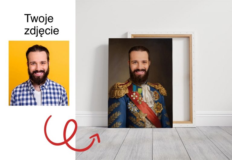 Oferujemy spersonalizowane portrety, na których możesz być przedstawiony jako generał, wykorzystując Twoje zdjęcie. To idealny prezent dla siebie lub bliskiej osoby, zapewniający wyjątkową ozdobę wnętrza i niezapomnianą pamiątkę.