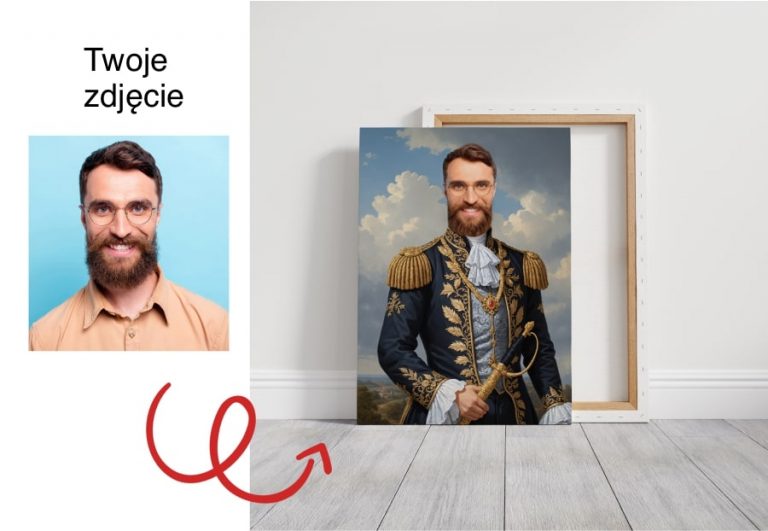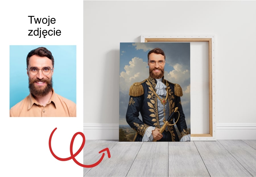 Oferujemy portret, który pozwoli Ci przenieść się w czasie i wcielić się w postać historyczną! Portret Napoleona z Twoim własnym zdjęciem to idealny sposób, aby stać się bohaterem epoki napoleońskiej. Dzięki naszej profesjonalnej obróbce graficznej, Twoja twarz zostanie wkomponowana w makietę z portretem Napoleona, zapewniając autentyczne i realistyczne wrażenia.