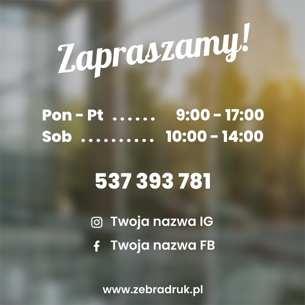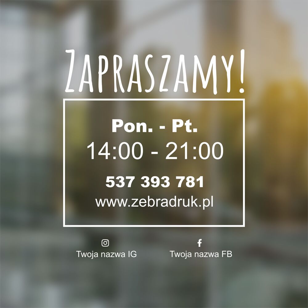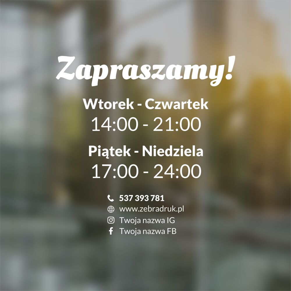 - Wybierz naklejkę z naszej kolekcji gotowych wzorów. Podaj nam godziny otwarcia, jakie mamy umieścić na naklejce. Przed realizacją wysyłamy projekt na akceptacje.