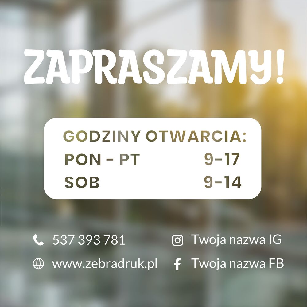 Oferujemy naklejki na szybę z godzinami pracy, które nie tylko informują, ale także wyróżniają Twoją firmę. Przekonaj się, dlaczego nasze naklejki są nie tylko praktycznym narzędziem informacyjnym, ale także estetycznym dodatkiem do Twojego biznesu.